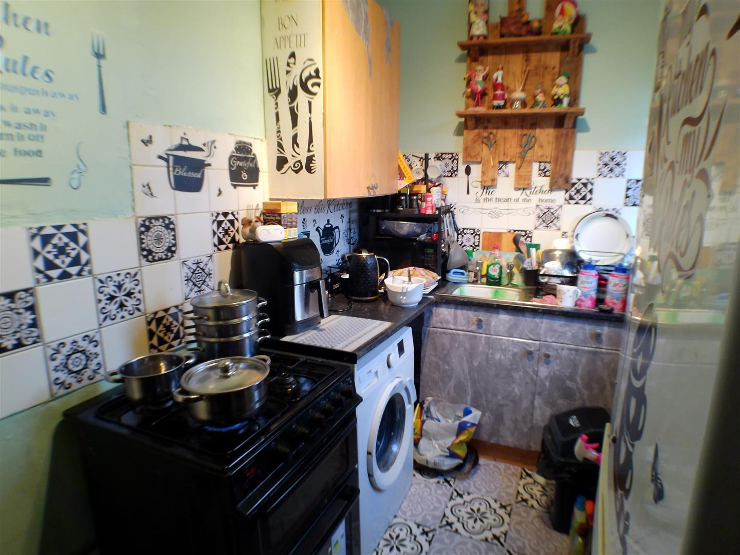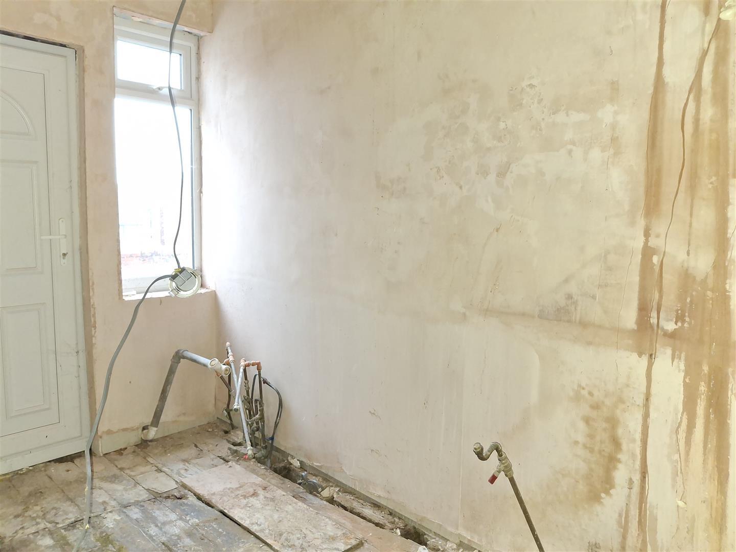 Range of wall and floor units with laminate worktop surfaces, sink unit and drainer, plumbing for washing machine, gas cooker point, central heating boiler, radiator, double glazed window to rear elevation and access door to rear.