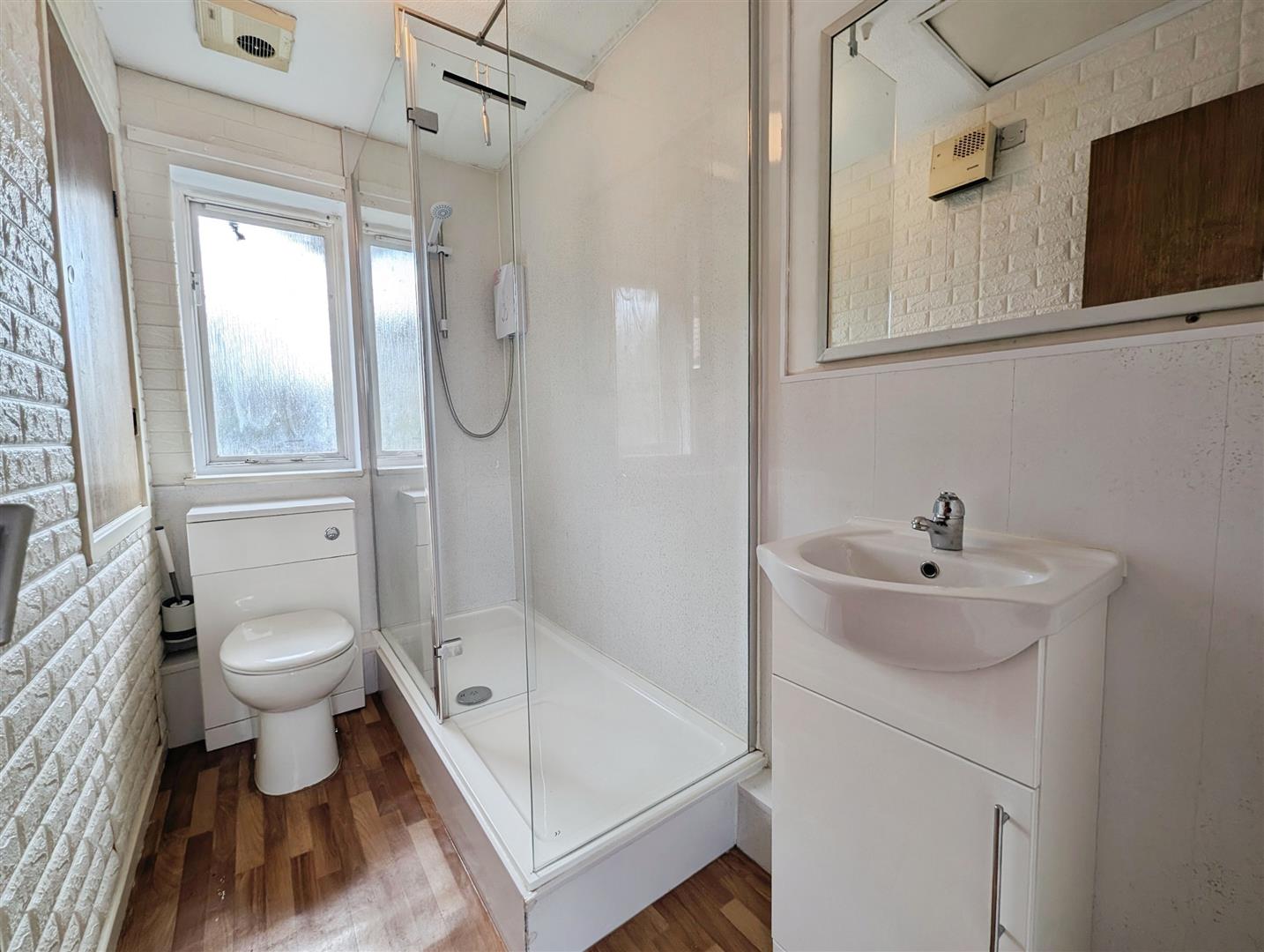 Frosted double glazed window to the rear. Shower cubicle. Low level WC. Vanity wash hand basin. Extractor fan. Storage cupboard. Loft access.
