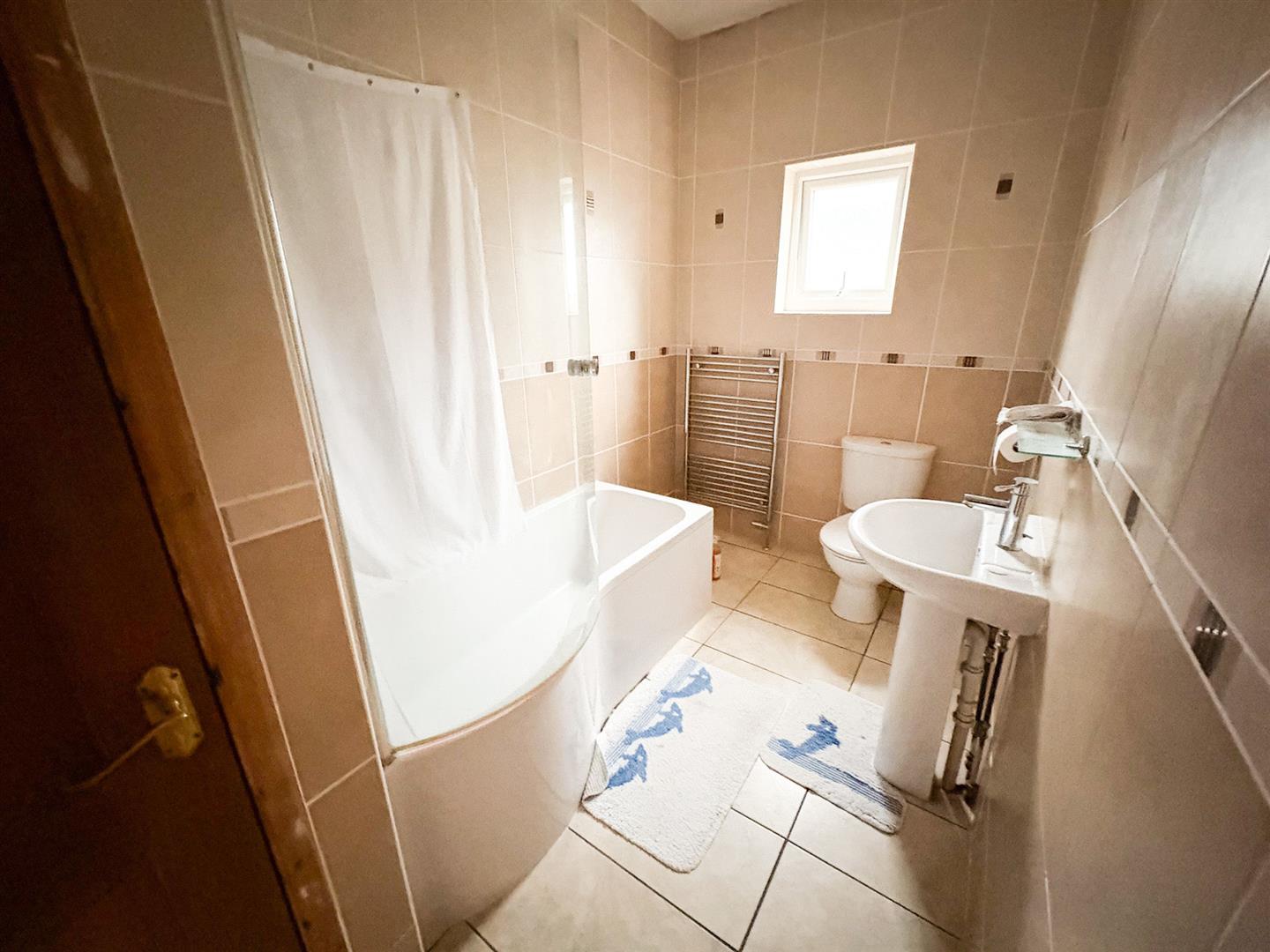 3 piece suite comprising panelled bath, low level WC, double glazed window to rear, heated towel rail, tiling to walls, tiled flooring and storage cupboard.