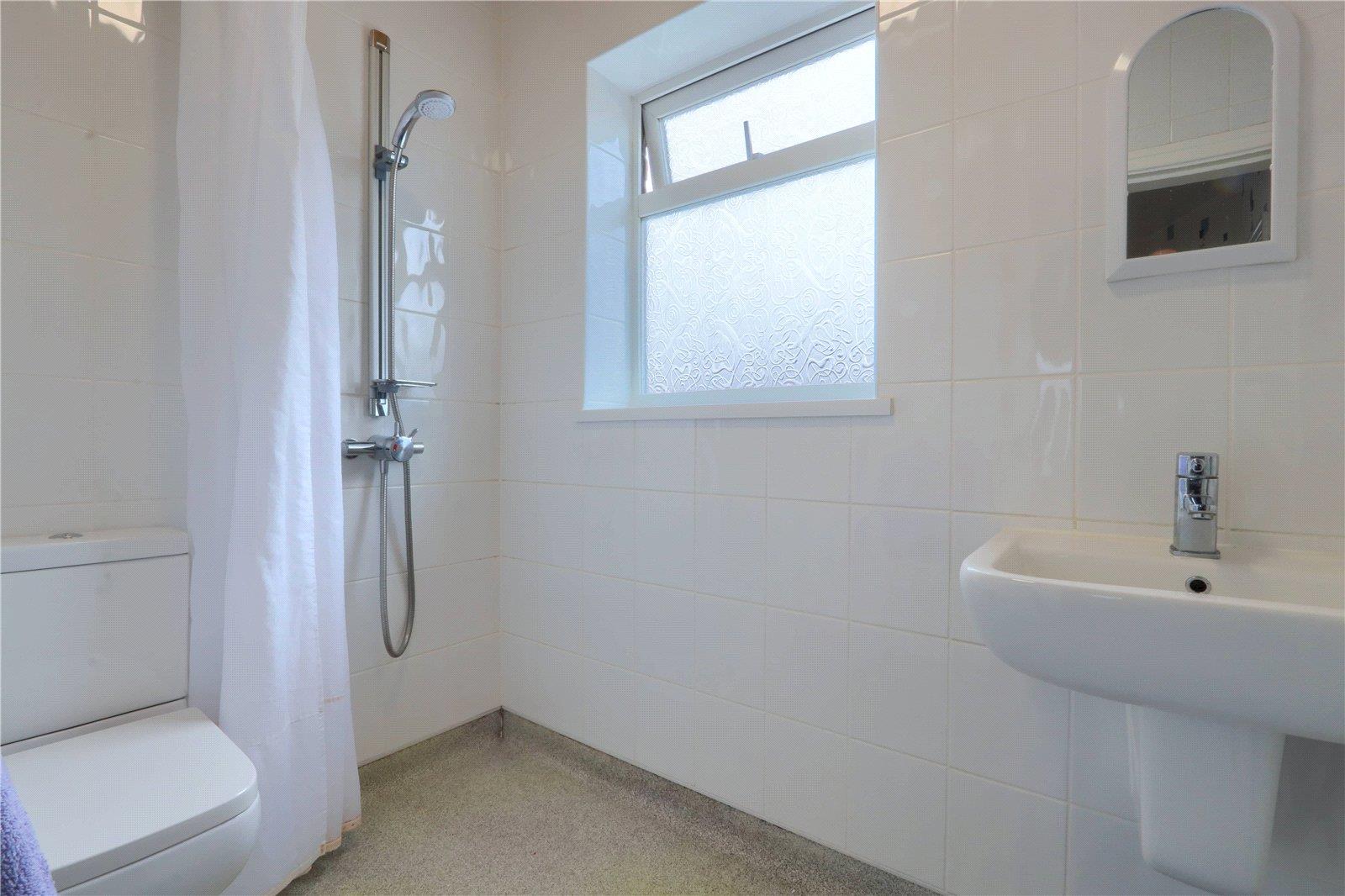 Fitted with a white suite with Mira thermostatic shower with extractor fan, fully tiled walls, radiator, wet room style flooring and upvc window.