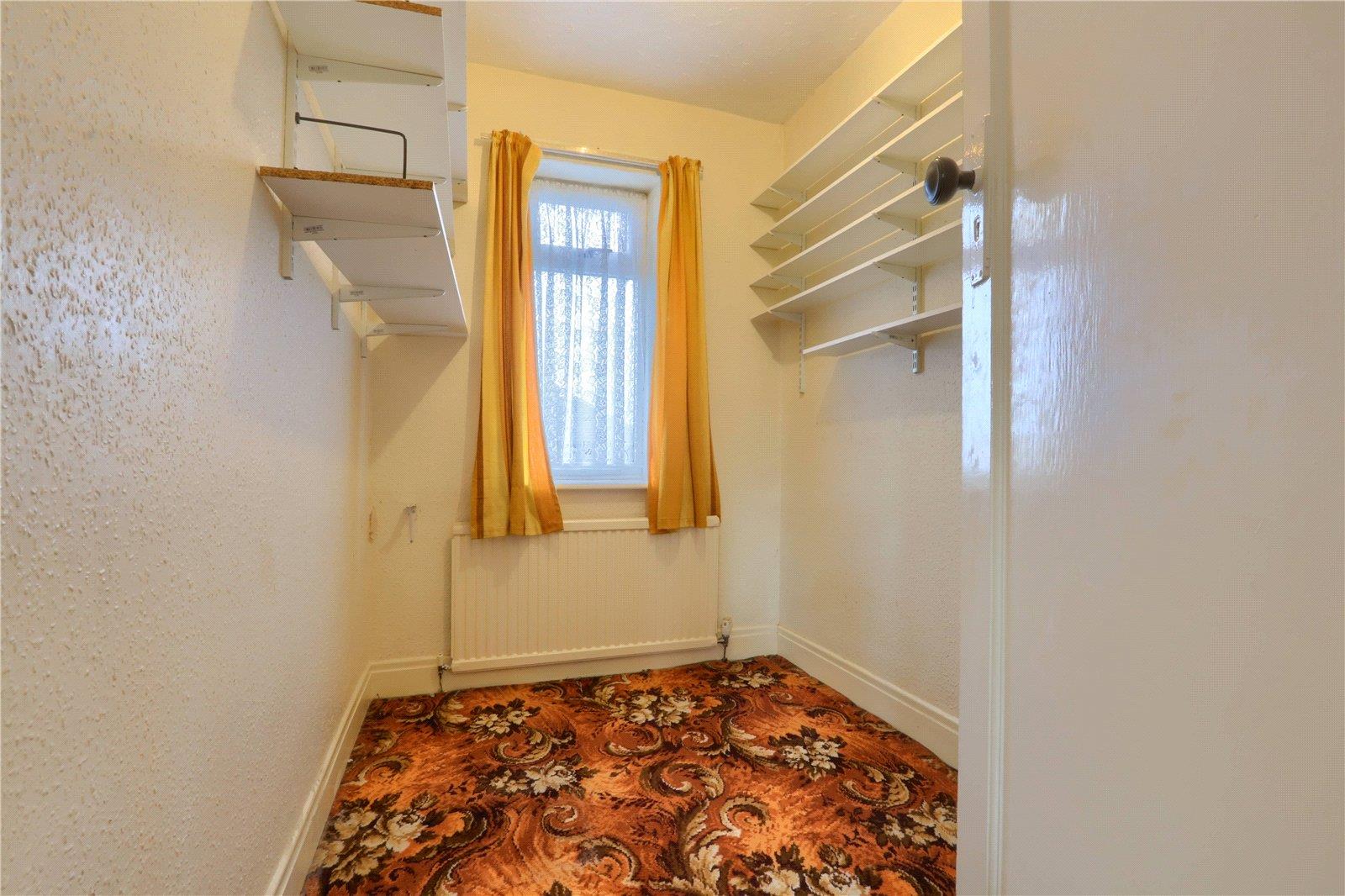 A double room with shelved storage cupboard housing the Bosch combi boiler, radiator, upvc window overlooks the rear garden.
