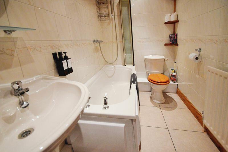 The rest of the layout comprises: 15 feet kitchen with range of cabinets and built in cooking appliances; landing; two bedrooms; fully tiled bathroom / WC with matching tiled flooring and mains shower over bath. Externally there is a rear yard with a brick built storage shed.