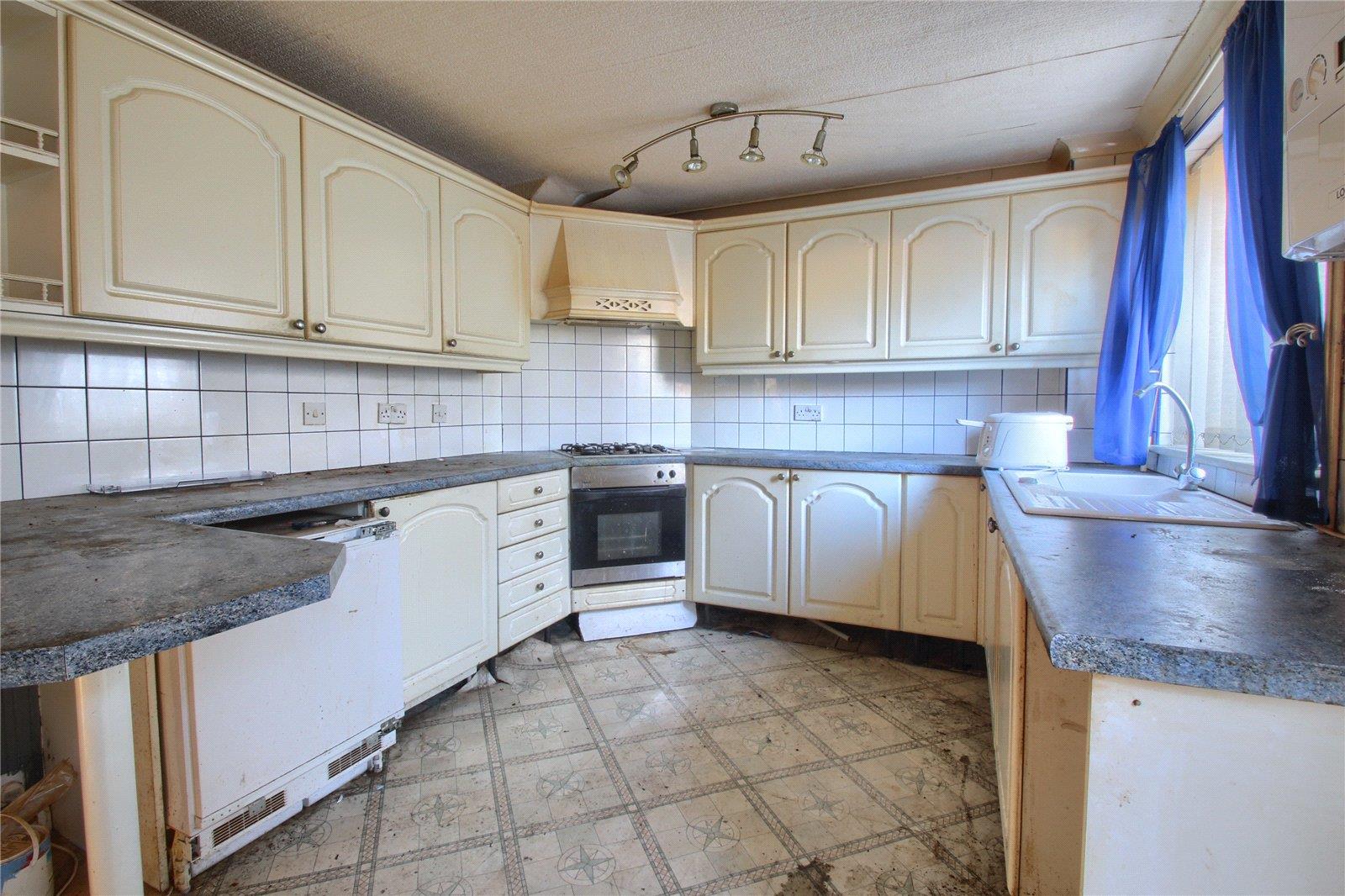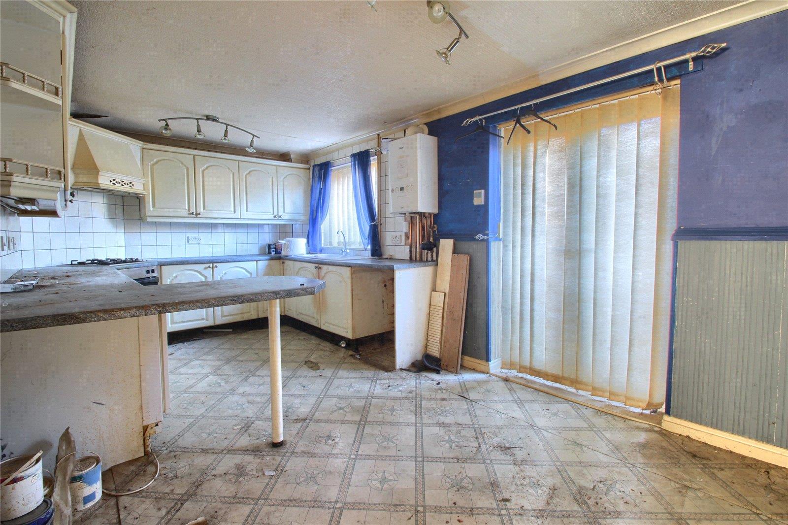 With wall, drawer, and floor units, electric oven, four ring gas hob, sink unit, radiator and UPVC patio door to the rear garden.