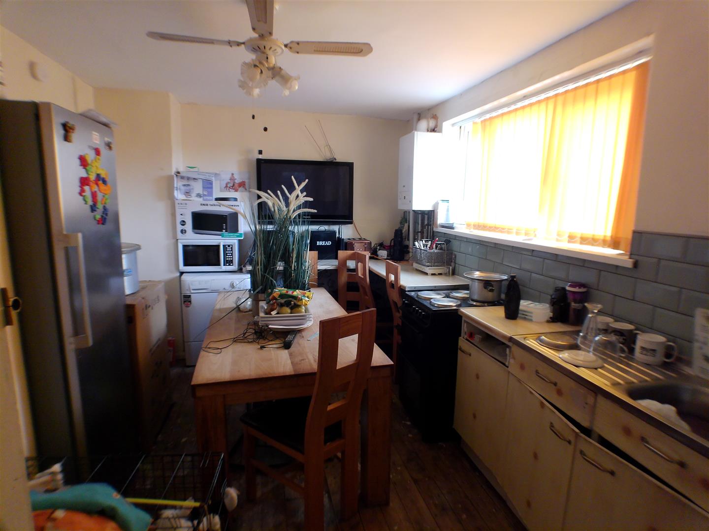 Range of wall and floor units with worktop surfaces, electric cooker point, plumbing for washing machine, central heating boiler, pantry and double glazed window.