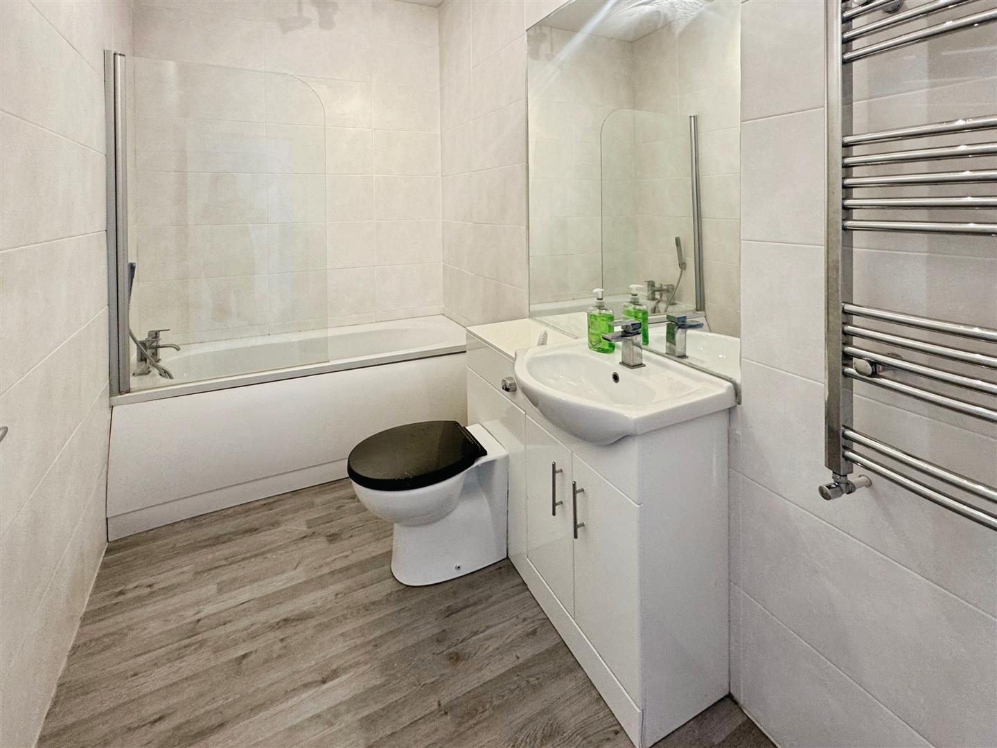 Bath with shower over, low level wc, vanity wash hand basin, fully tiled and heated towel rail.