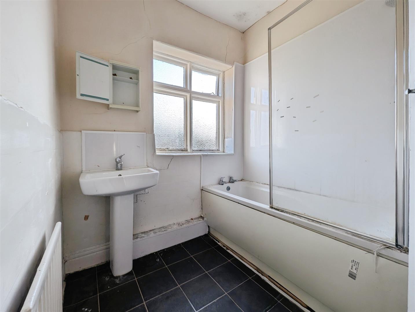 Frosted single glazed window to the rear. Panelled bath. Storage cupboard. Pedestal wash hand basin.