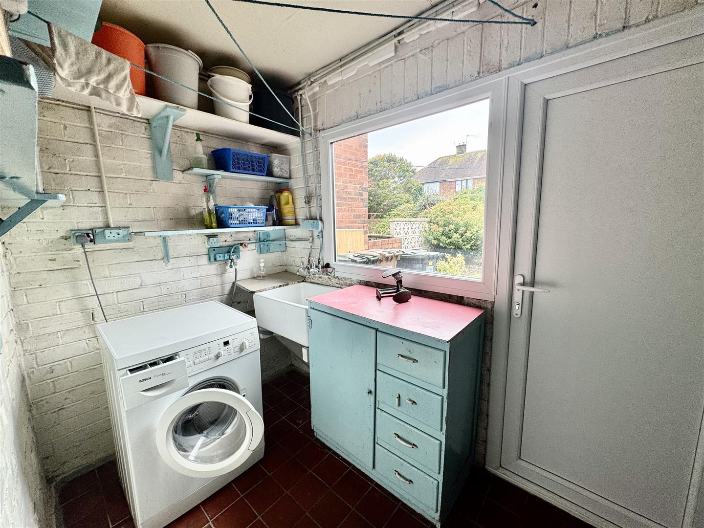 Belfast sink, plumbed for automatic washing machine, tiled floor, window, door to