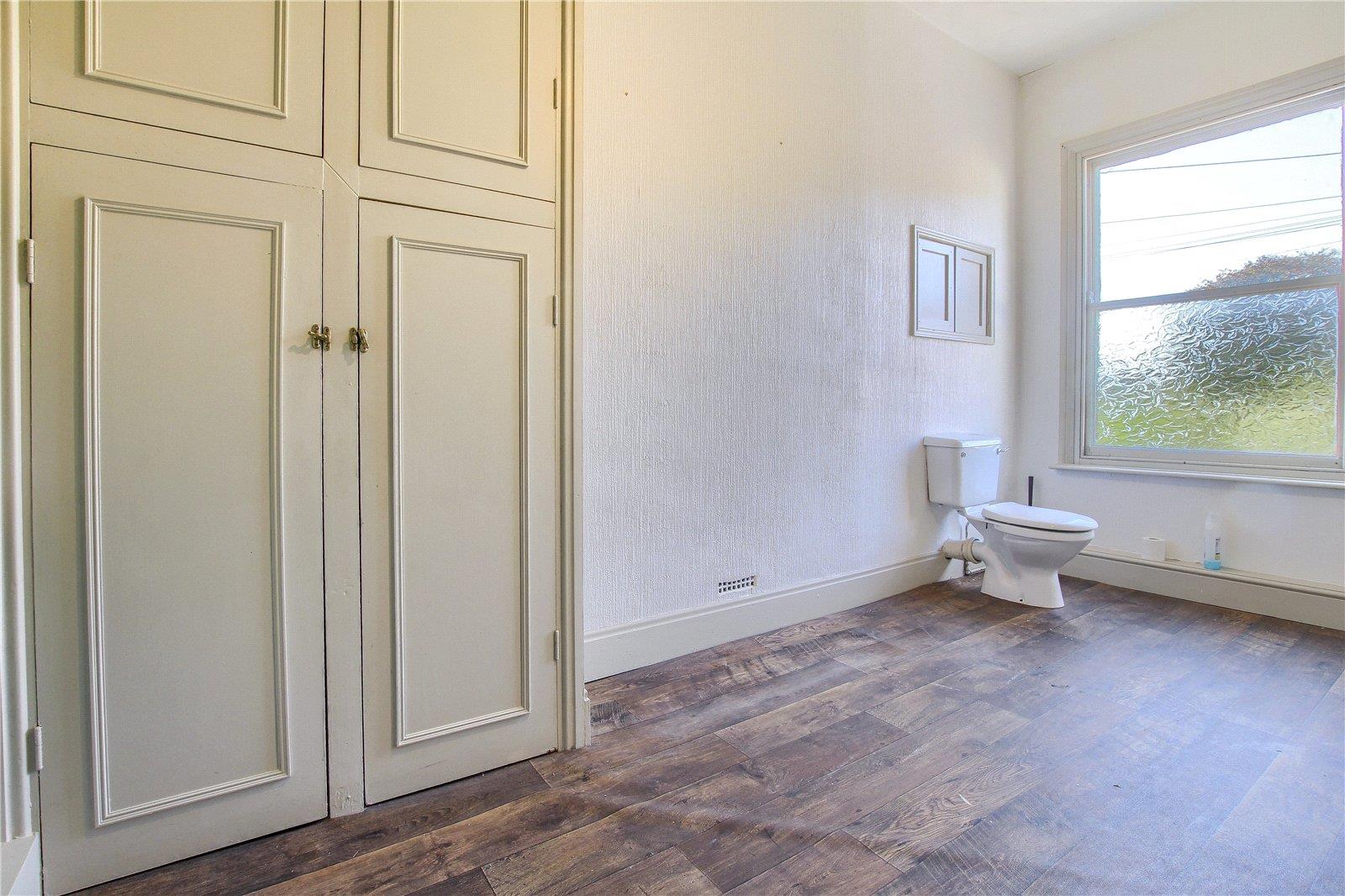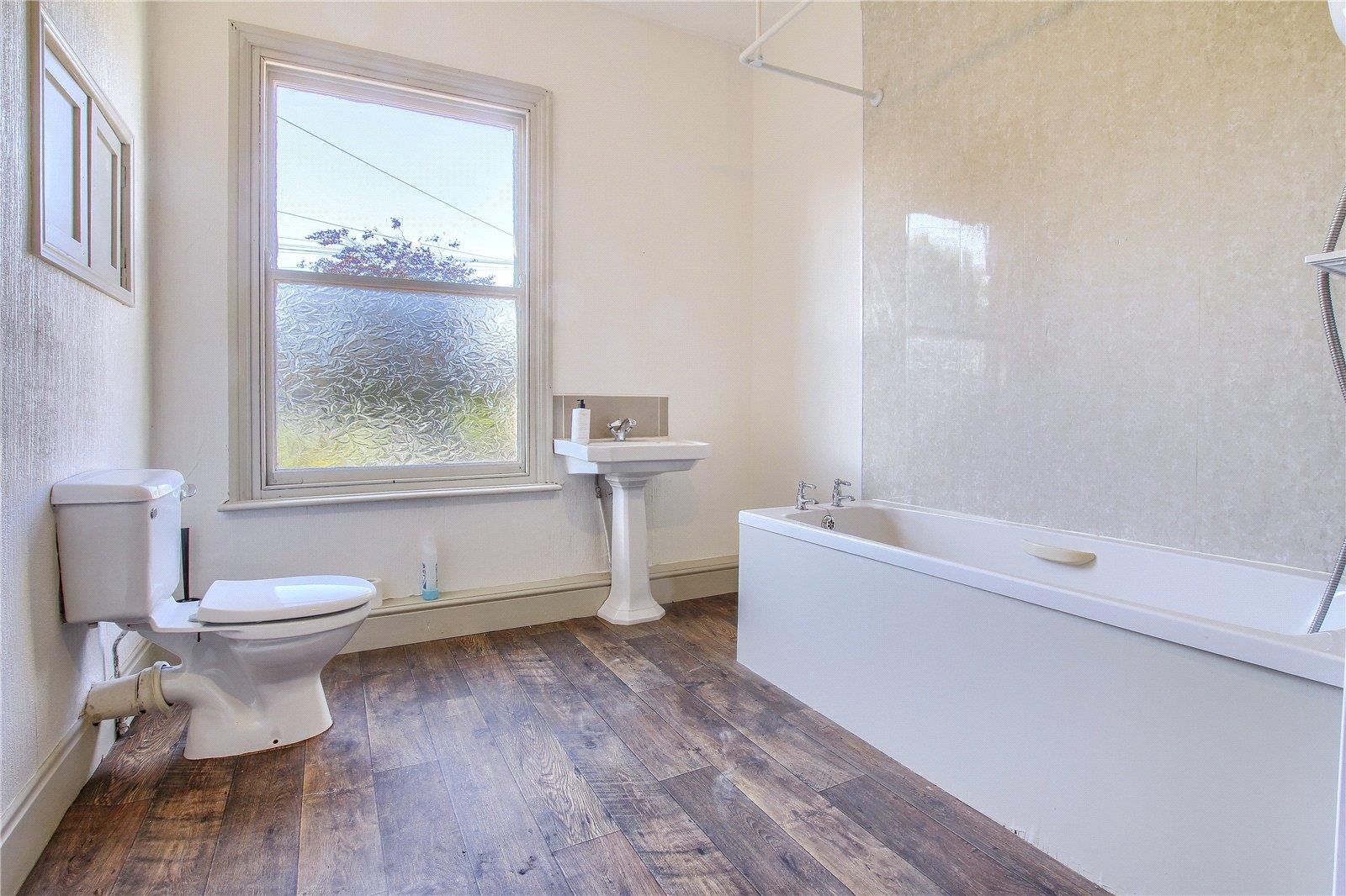 Fitted with a white three-piece suite comprising panelled bath with electric shower over and waterproof panelled walling, wash hand basin with mixer tap and tiled splashback, WC, woodgrain effect vinyl flooring and storage cupboard.