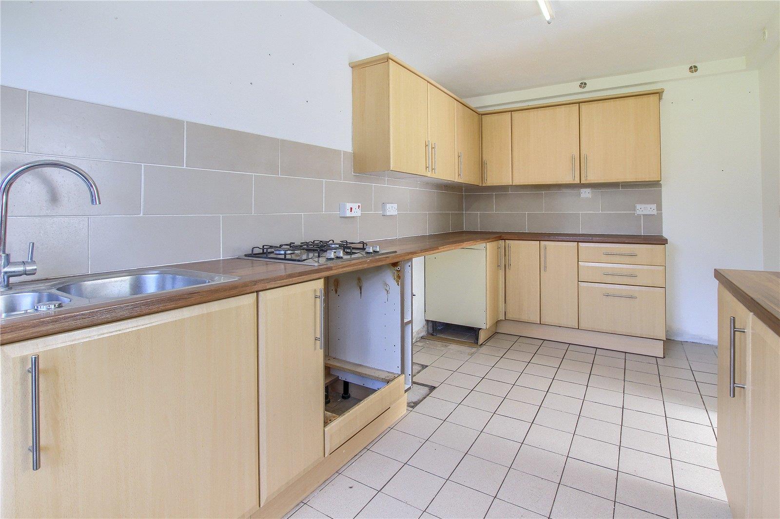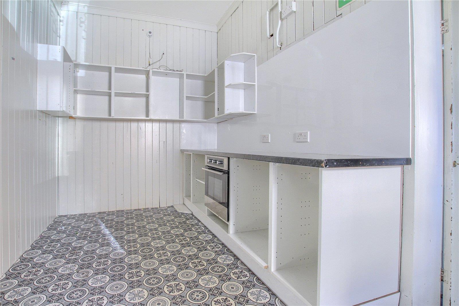 Fitted with a range of wall and floor units, complementary work surfaces, slot in electric cooker, stainless steel sink, tile effect vinyl flooring and side external door.