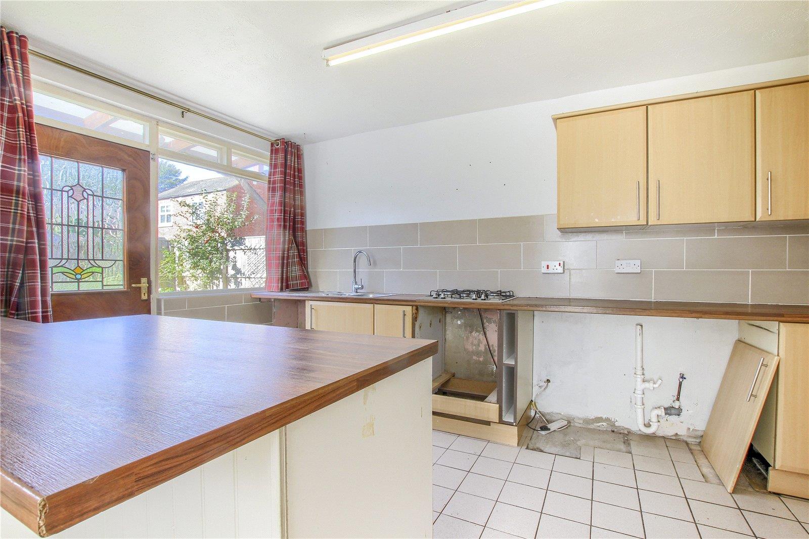 Fitted with a range of pine effect wall, drawer, and floor units with complementary wood effect work surface and breakfast bar, four ring gas hob, one and a half bowl stainless steel sink with mixer tap and drainer, vertical tube radiator, wood grain effect flooring in the breakfast area and tiled flooring in the kitchen area, and wooden door with glass inlay to the westerly facing rear garden.