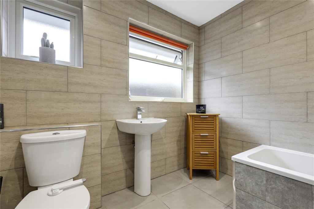 Modern suite comprising P’ shaped bath with shower over and screen, low level WC, wash hand basin, fully tiled walls and floor, and chrome heated towel rail.