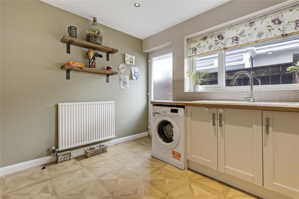 With a smart range of fitted wall and floor units, complementing work surfaces, electric oven and gas hob with extractor over, plumbing for washing machine, space for fridge and freezer, spotlighting and side external door