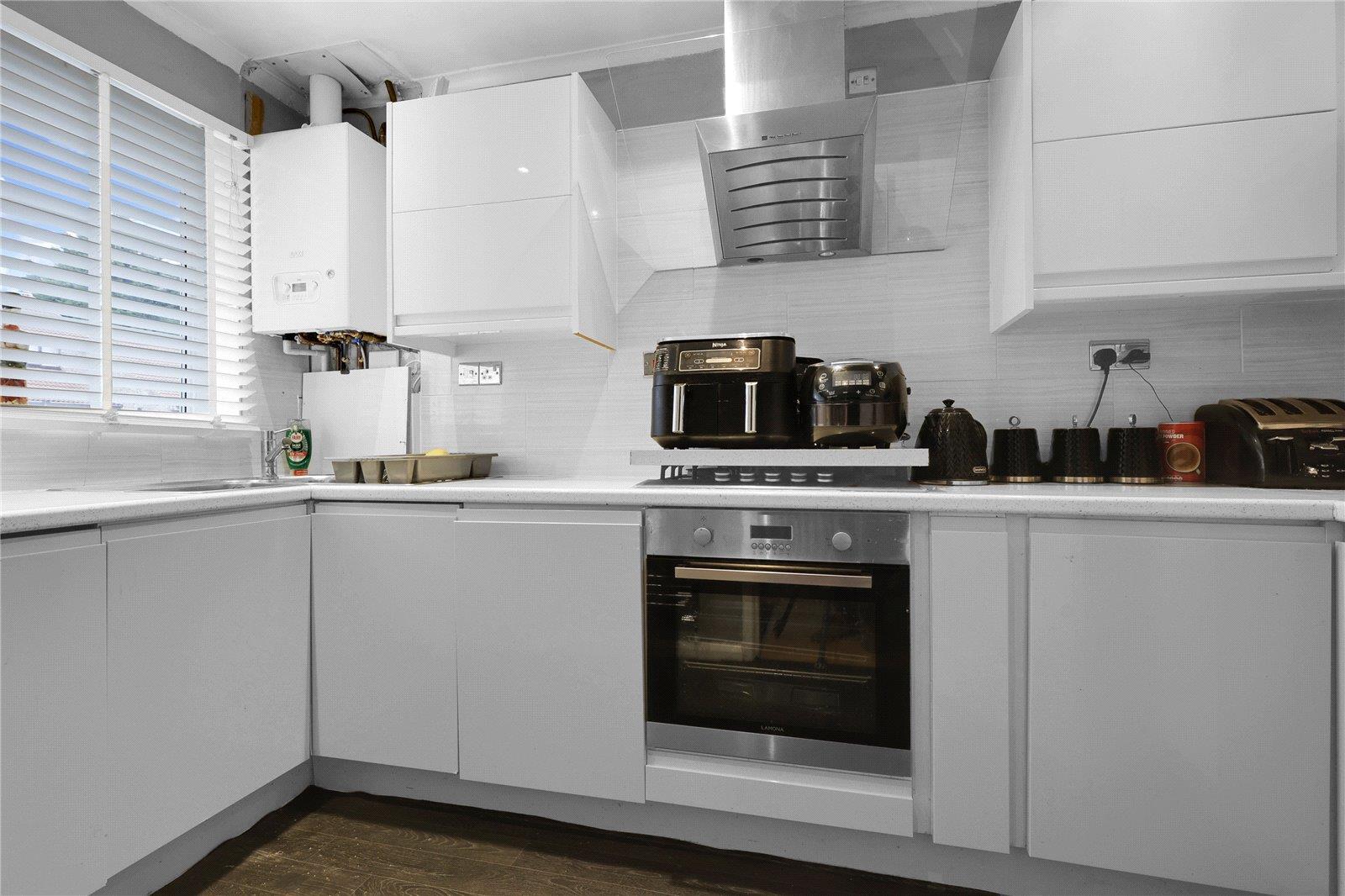 With a modern range of fitted wall and floor units, electric oven, gas hob with extractor over, integrated microwave, integrated fridge and freezer, and wall mounted central heating boiler.