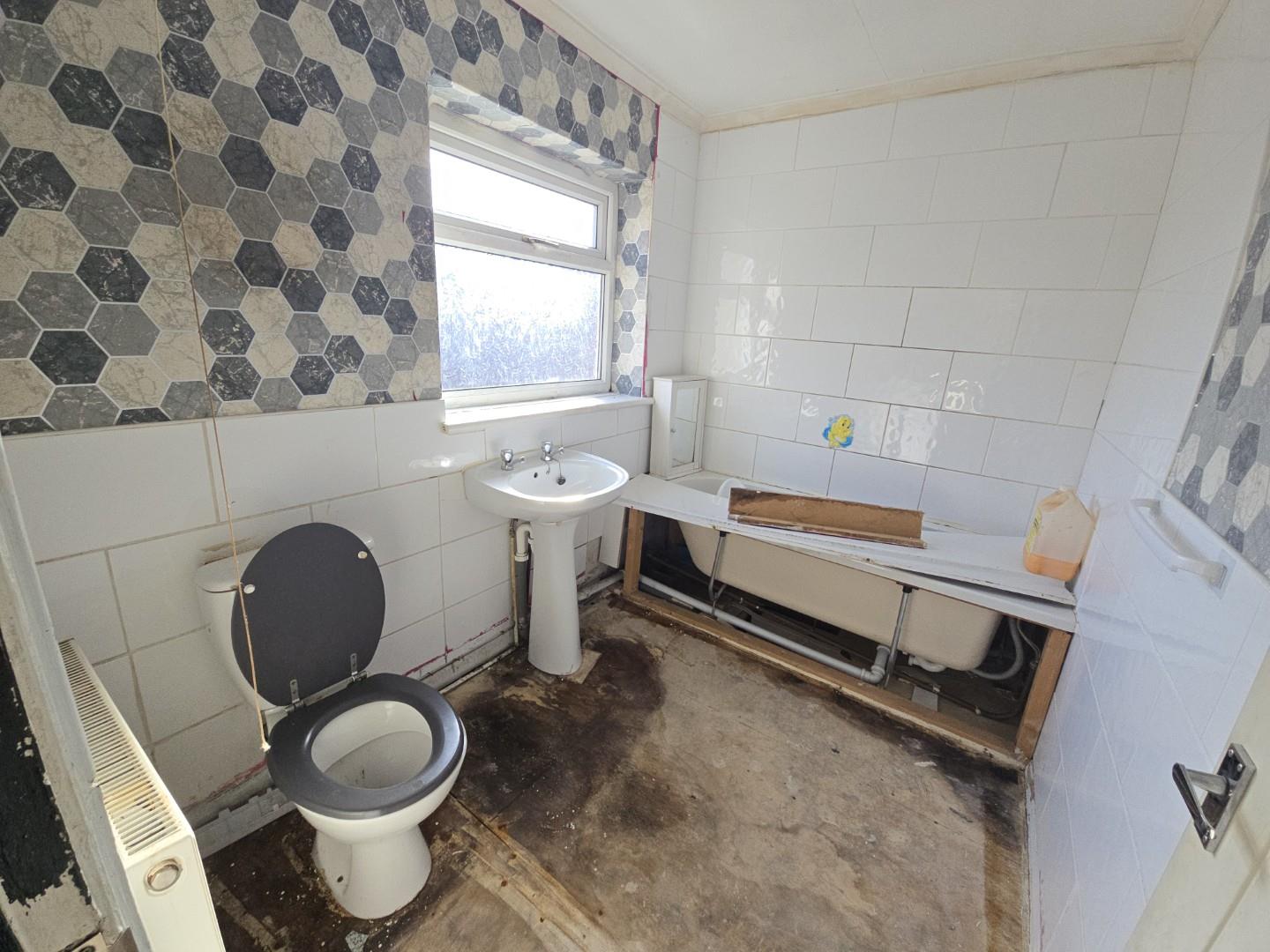 Double glazed window, fitted with a three piece white bathroom suite comprising of a panel bath, pedestal wash hand basin, low level W/C, part tiled walls, wall mounted radiator.