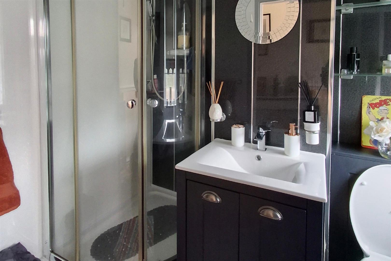 Contemporary Shower room with walk in corner shower unit, wash basin, wc, tiled flooring, double glazed window.