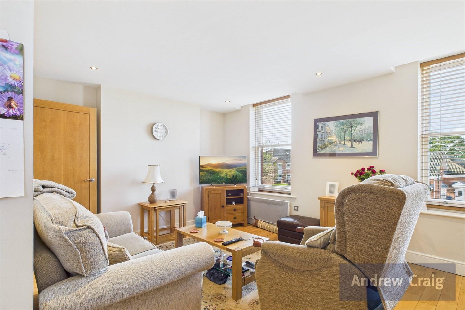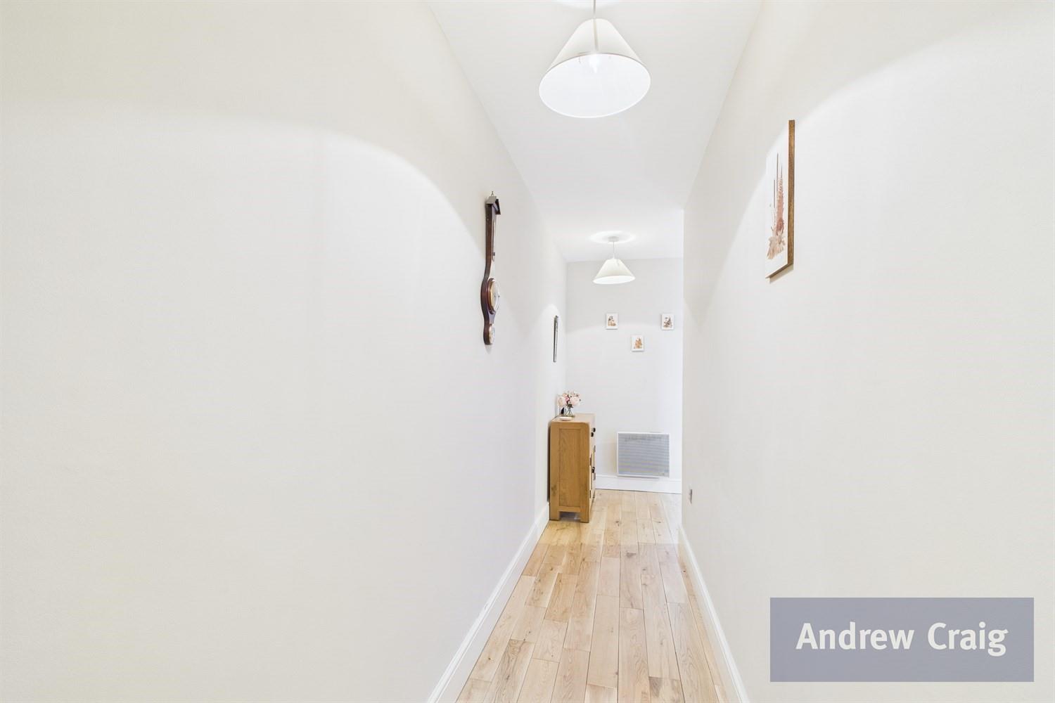 Inside, a generous hallway leads to a sleek, contemporary shower room and two well proportioned double bedrooms. The open plan lounge and dining area enjoy a bright, sunny aspect and flow seamlessly into a fitted kitchen with integrated appliances, creating an ideal space for everyday living or entertaining.