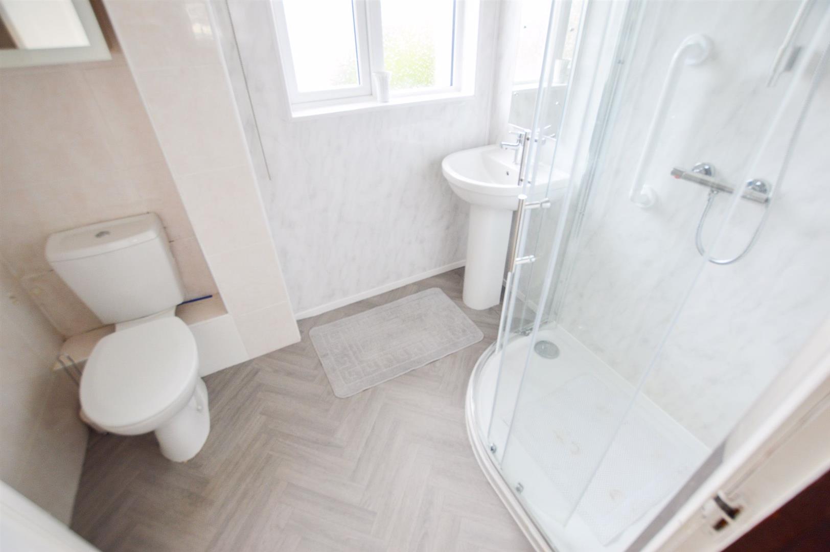 Double glazed frosted window to rear, shower cubicle, pedestal wash hand basin, low level w.c, cladding to walls, double radiator.