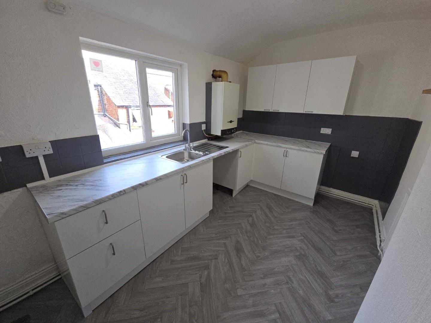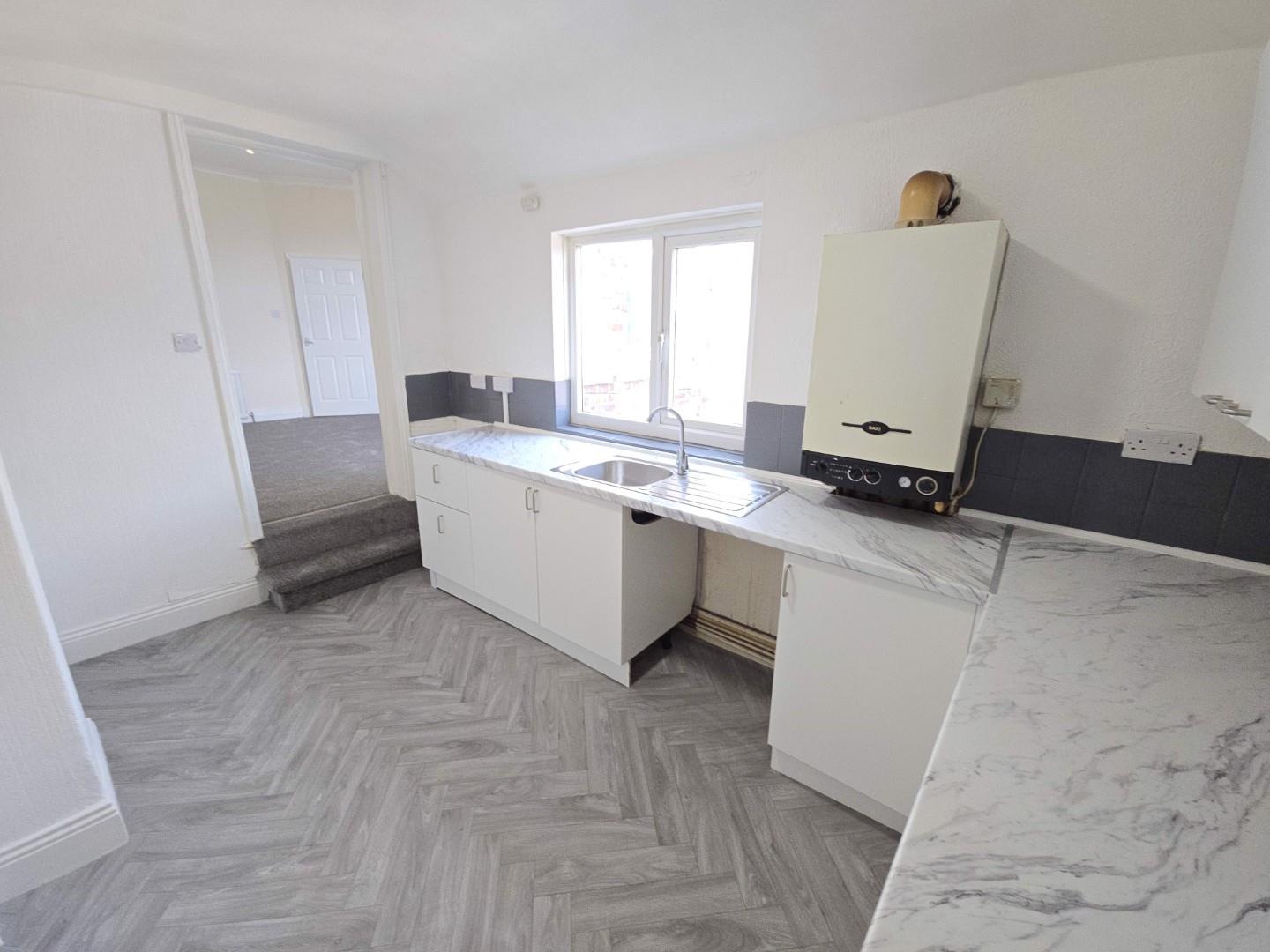 Double glazed window to rear elevation, fitted with a range of wall draw abase units with co-ordinating work surfaces, stainless steel sink drainer unit with mixer tap, boiler, wall mounted radiator.