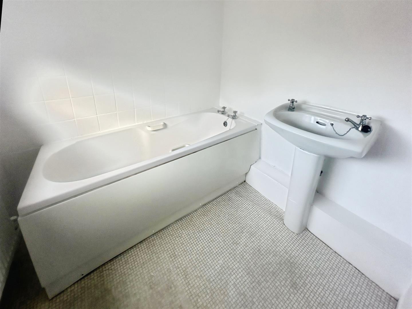 4 Piece white suite comprising of: Panelled bath, pedestal wash hand basin, single radiator, tiling to walls, double glazed rear window.