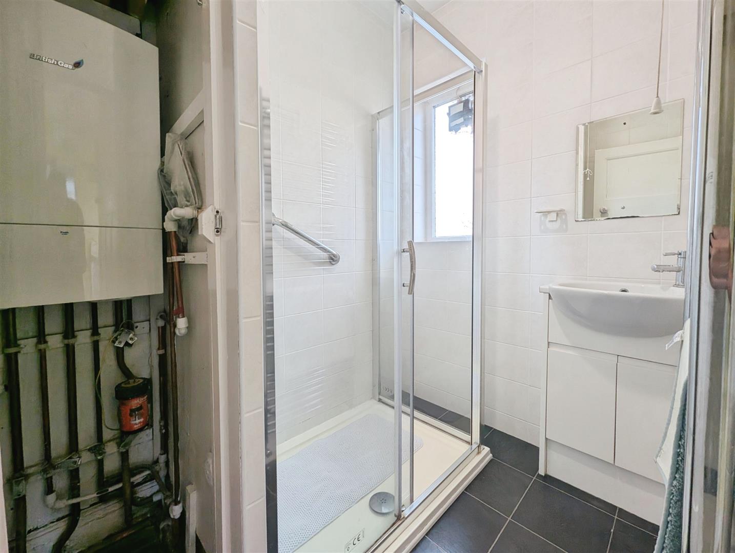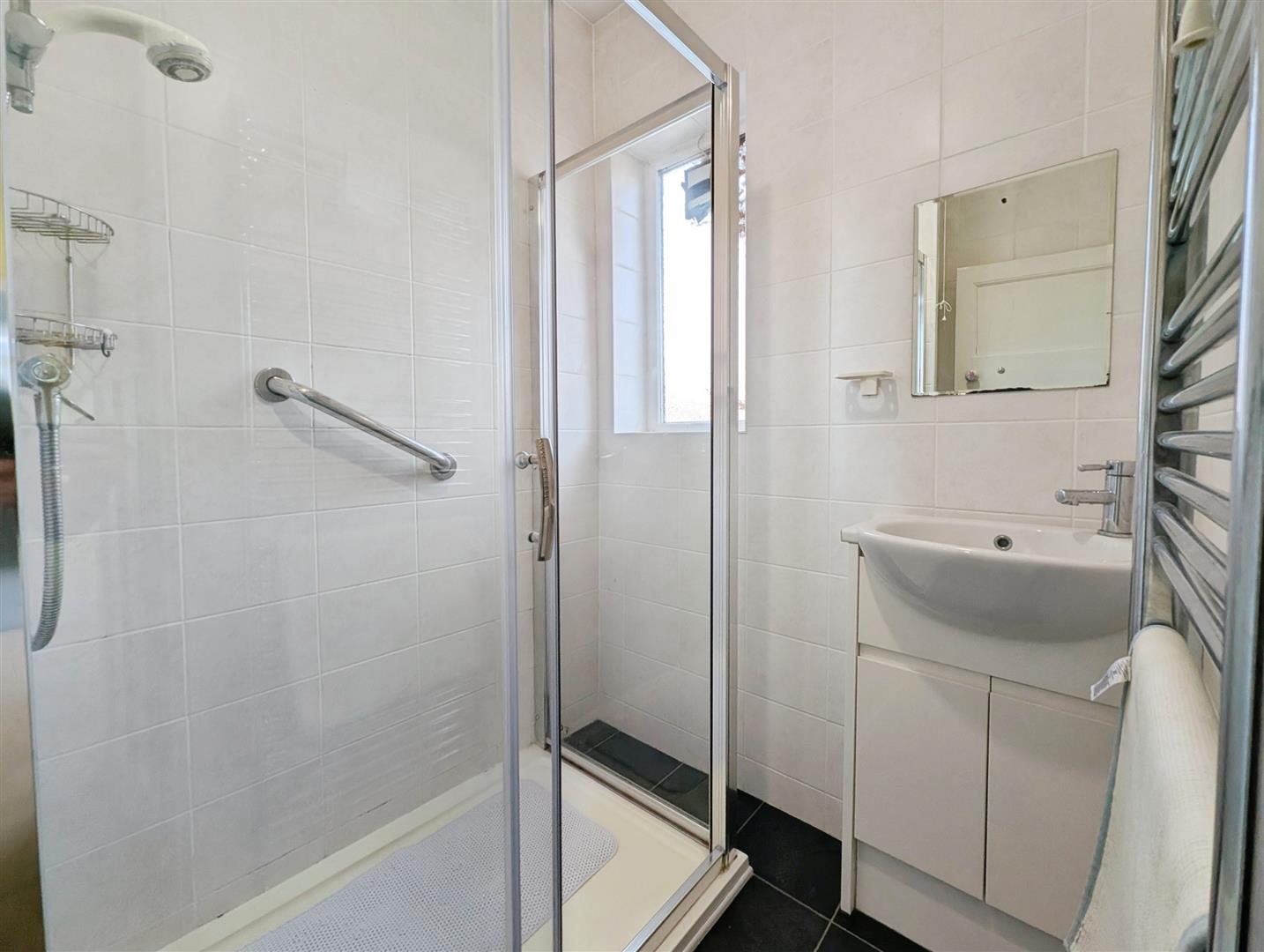 Frosted double glazed window to the rear. Shower cubicle. Vanity wash hand basin. Heated towel rail
