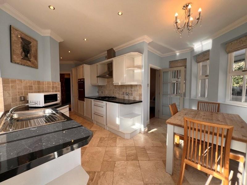Fitted with a range of wall and base units, work surfaces, 1 ½ bowl sink unit, built in double oven, built in gas hob, extractor hood, and space for auto washer, integrated dishwasher, fridge and freezer, part tiled walls, tiled floor, coving to ceiling, wall mounted central heating boiler, double glazed windows to the front and side.