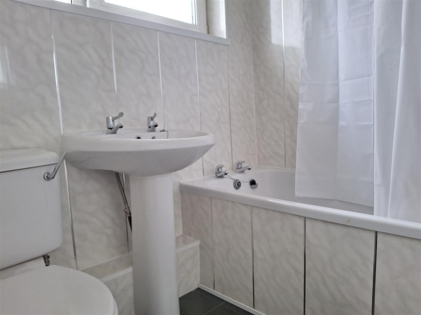 Three piece suite comprising low level wc, pedestal wash hand basin, bath with electric shower over, double glazed window to rear elevation, radiator and panelled walls.
