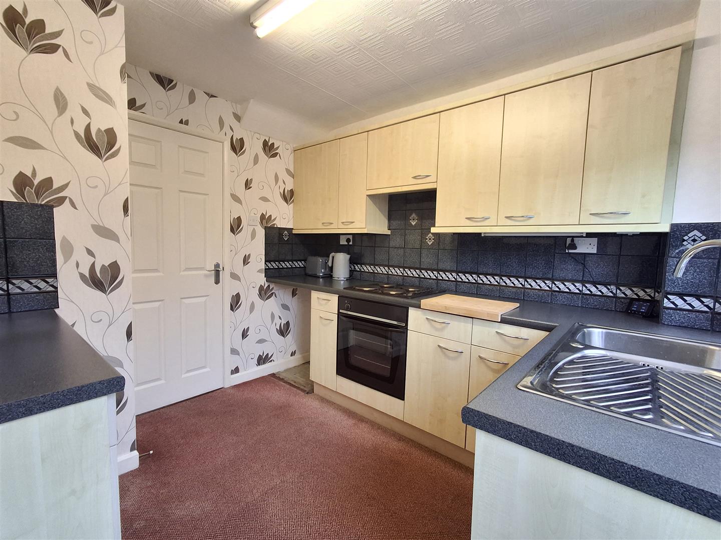 Range of wall and floor units with laminate worktop surfaces, built in electric oven and hob, sink unit and drainer, tiled splashbacks, built in pantry, radiator, double glazed window to rear and part glazed door to rear.