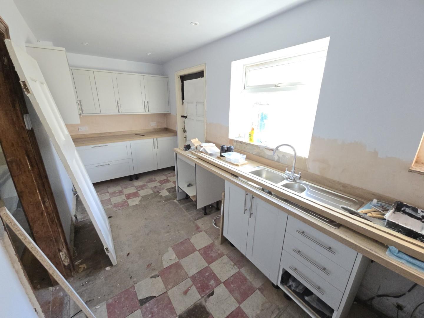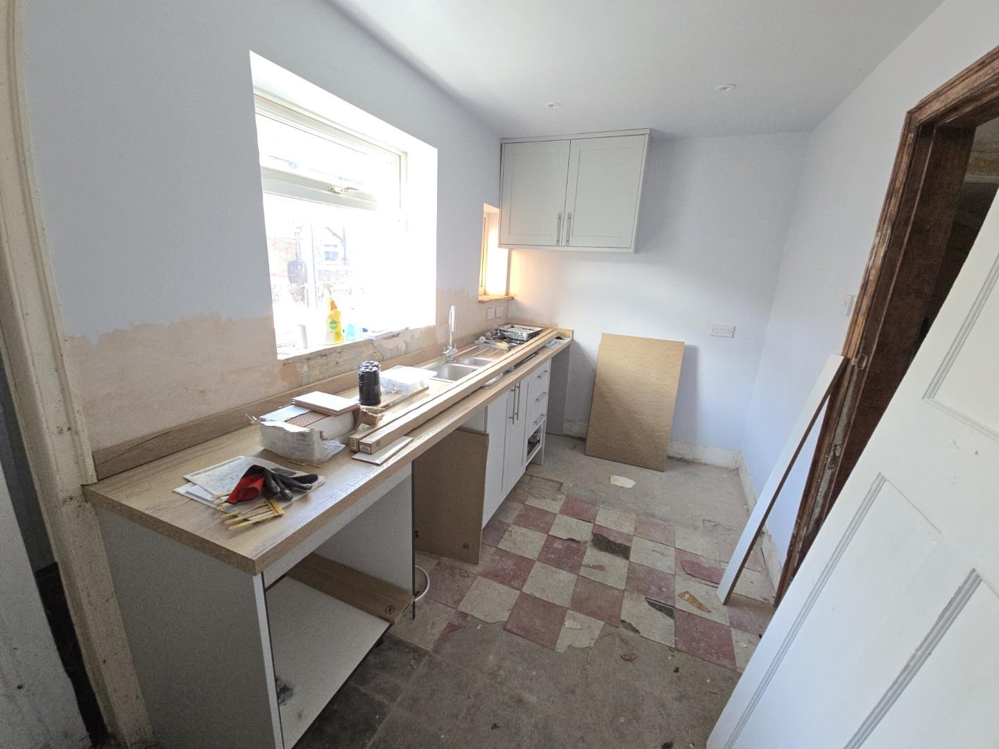 Brand new, fitted ‘Howdens’ kitchen boasting a good range of wall, base and drawer units finished in a stylish matte grey. 1.5 Bowl stainless steel sink and drainer, 2 uPVC double glazed windows to rear. Additional splashback tiles are present but not installed.