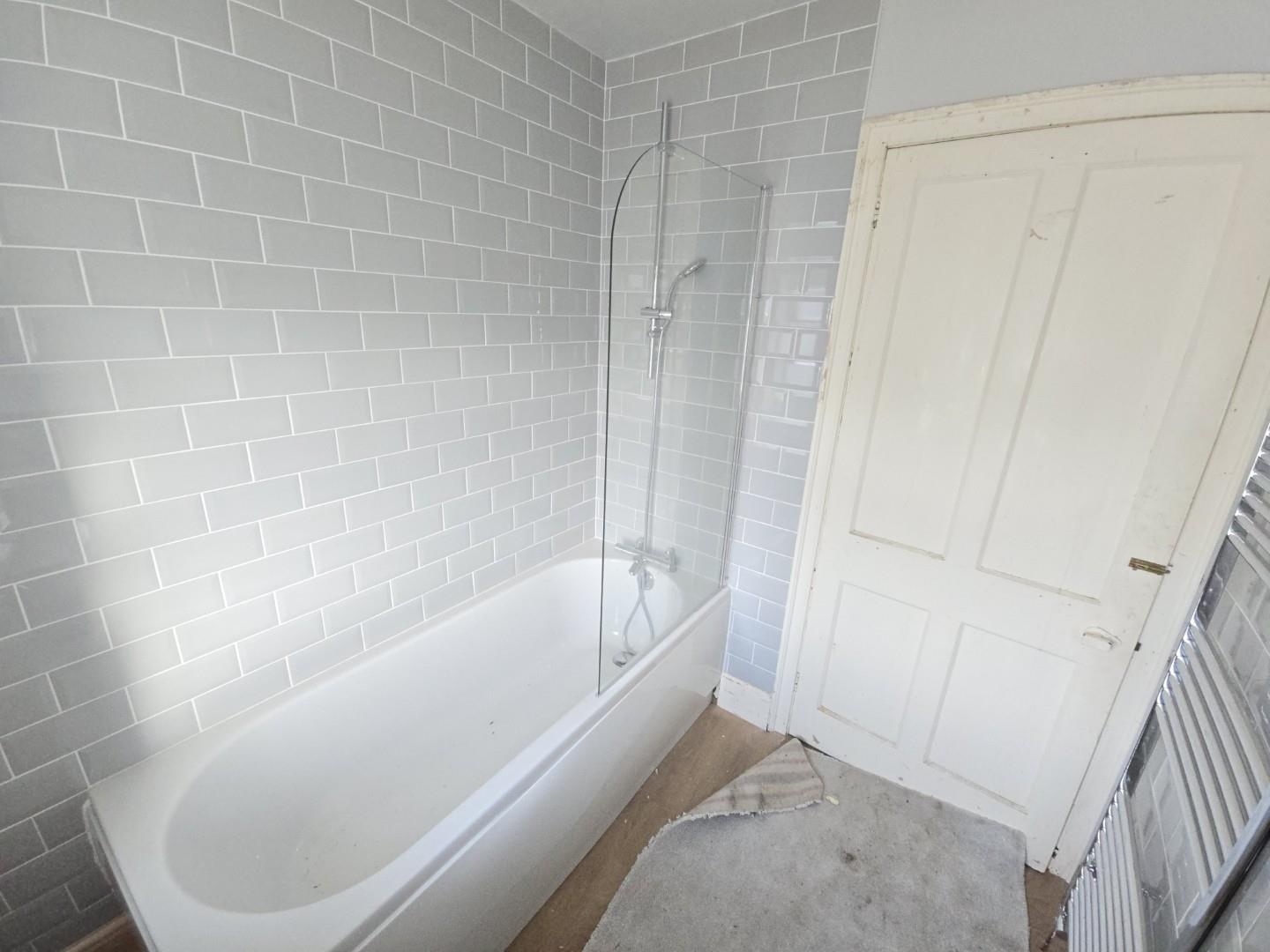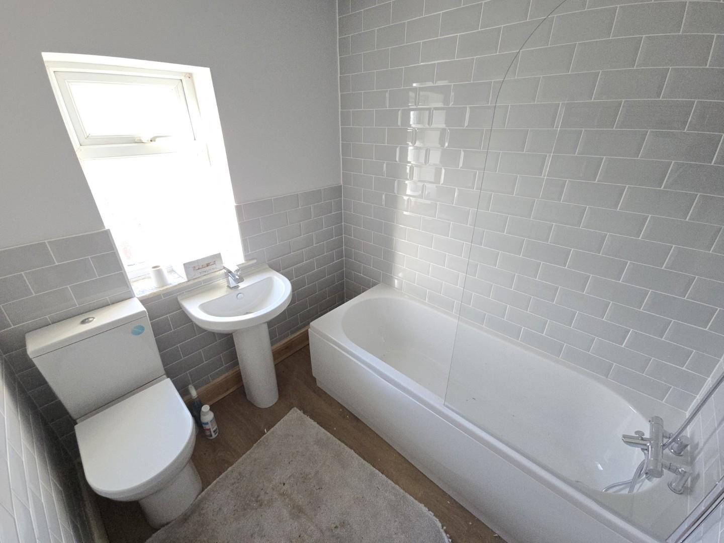 Brand new fitted bathroom suite comprising of low level W/C pedestal handwash basin and panelled bath with mains powered shower over, chrome heated towel rail, recessed spotlighting and uPVC double glazed window to rear.