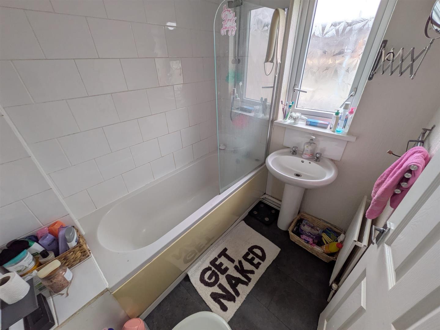 Double glazed window to the rear, panelled bath with shower over, wc, sink unit, part tiled and radiator.