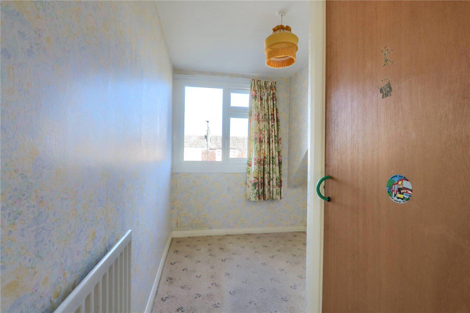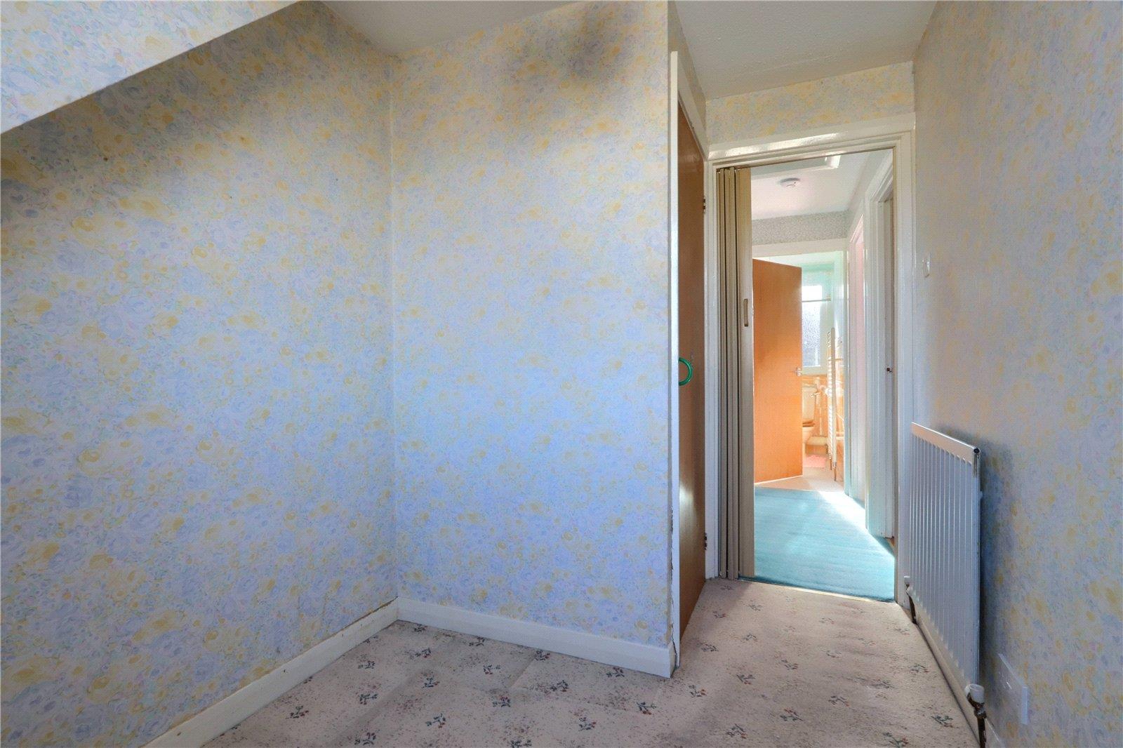 A single room with traditional style decoration, radiator, over stairs storage cupboard and UPVC window.