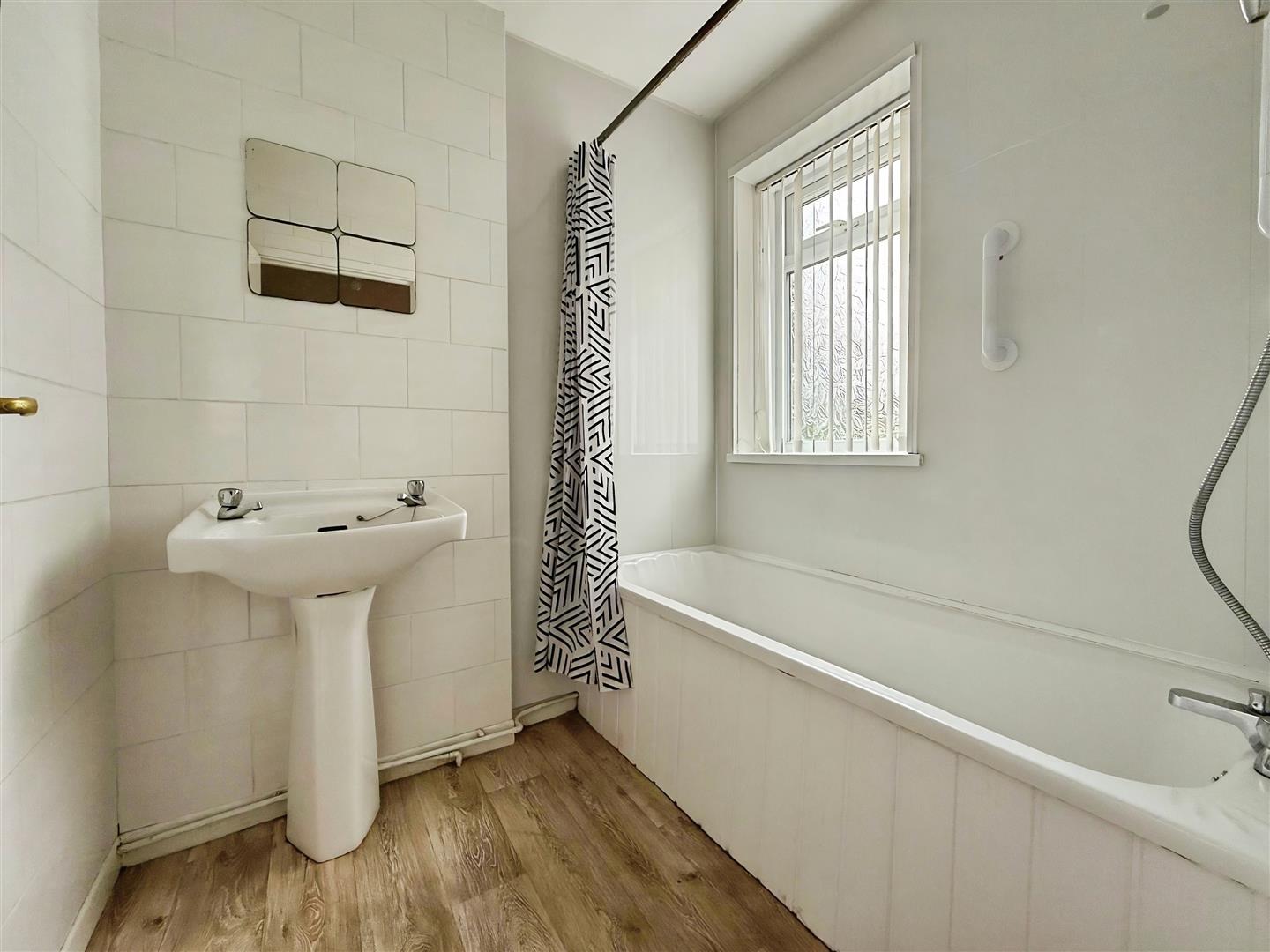 Frosted double glazed window to the rear. Panelled bath with shower over. Pedestal wash hand basin. Radiator.