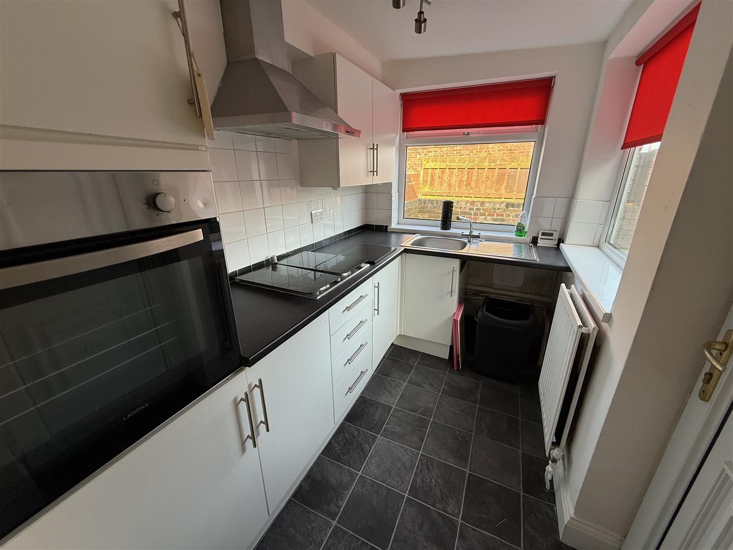 Double glazed window to front elevation, double glazed window to side elevation, double glazed door to side elevation, fitted with a range of wall, draw and base units with coordinating work surfaces, oven and grill unit, four burner hob with extractor hood over, tiled splashbacks, stainless steel sink and drainer unit, wall mounted radiator.